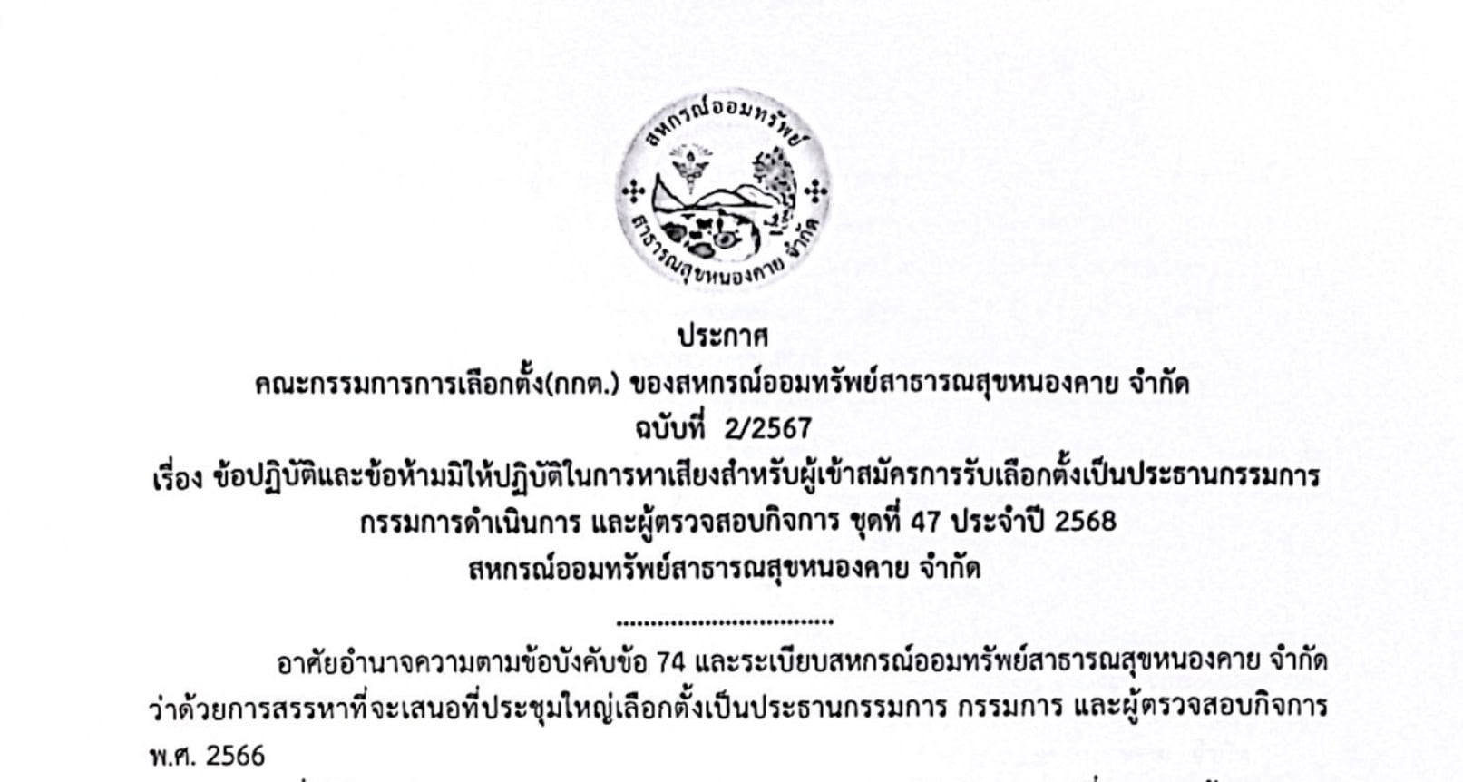 ประกาศ คณะกรรมการการเลือกตั้ง(กกต.) ของสหกรณ์ออมทรัพย์สาธารณสุขหนองคาย จำกัด ฉบับที่ 2/2567 เรื่อง ข้อปฏิบัติและข้อห้ามมิให้ปฏิบัติในการหาเสียงสำหรับผู้เข้าสมัครการรับเลือกตั้งเป็นประธานกรรมการกรรมการดำเนินการ และผู้ตรวจสอบกิจการ ชุดที่ 47 ประจำปี 2568 สหกรณ์ออมทรัพย์สาธารณสุขหนองคาย จำกัด