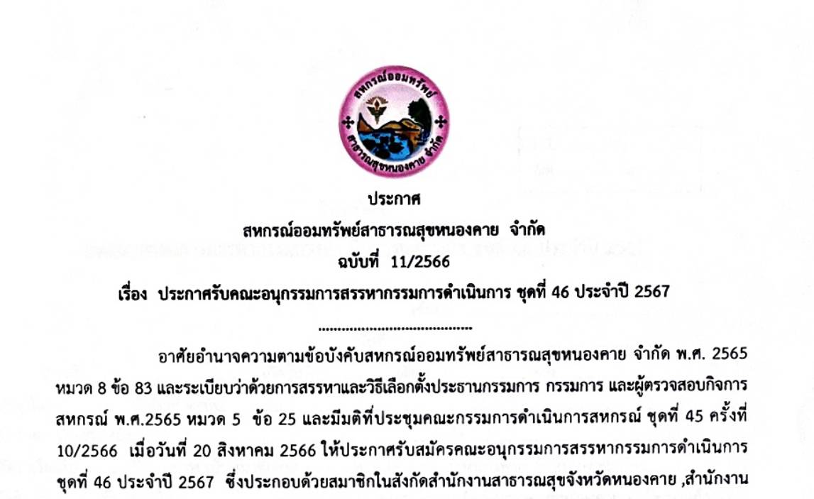 ประกาศ สหกรณ์ออมทรัพย์สาธารณสุขหนองคาย จำกัด ฉบับที่ 11/2566 เรื่อง ประกาศรับคณะอนุกรรมการสรรหากรรมการดำเนินการ ชุดที่ 46 ประจำปี 2567