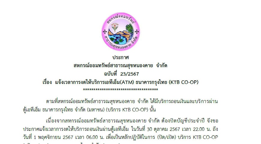 ประกาศ สหกรณ์ออมทรัพย์สาธารณสุขหนองคาย จำกัด ฉบับที่ 23/2567 เรื่อง แจ้งเวลาการงดให้บริการเอทีเอ็ม(ATM) ธนาคารกรุงไทย (KTB CO-OP)