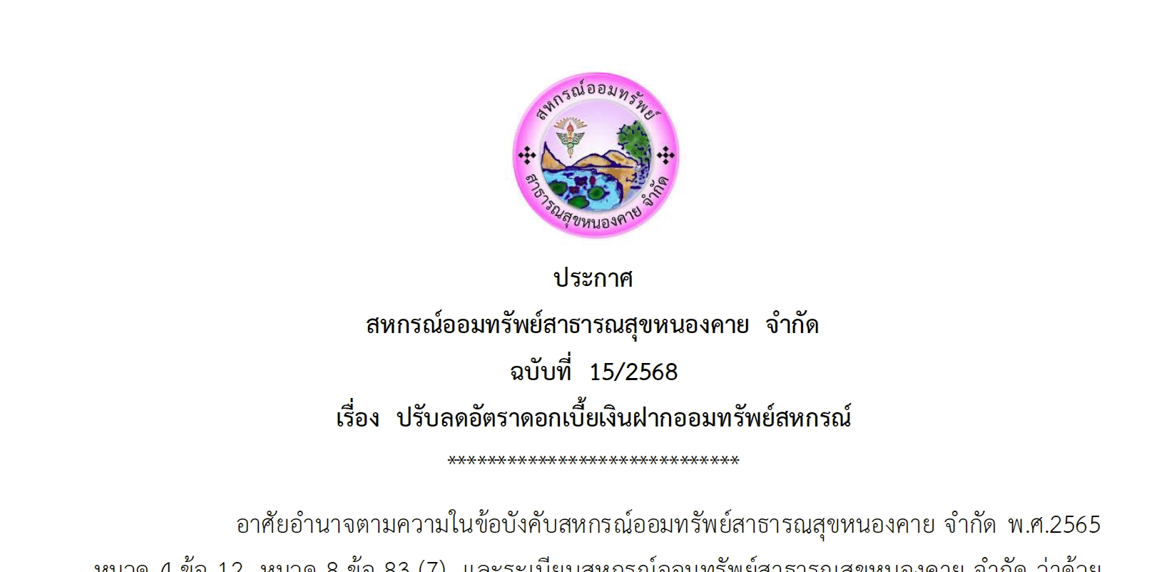 ประกาศ สหกรณ์ออมทรัพย์สาธารณสุขหนองคาย จำกัด ฉบับที่ 15/2568 เรื่อง ปรับลดอัตราดอกเบี้ยเงินฝากออมทรัพย์สหกรณ์