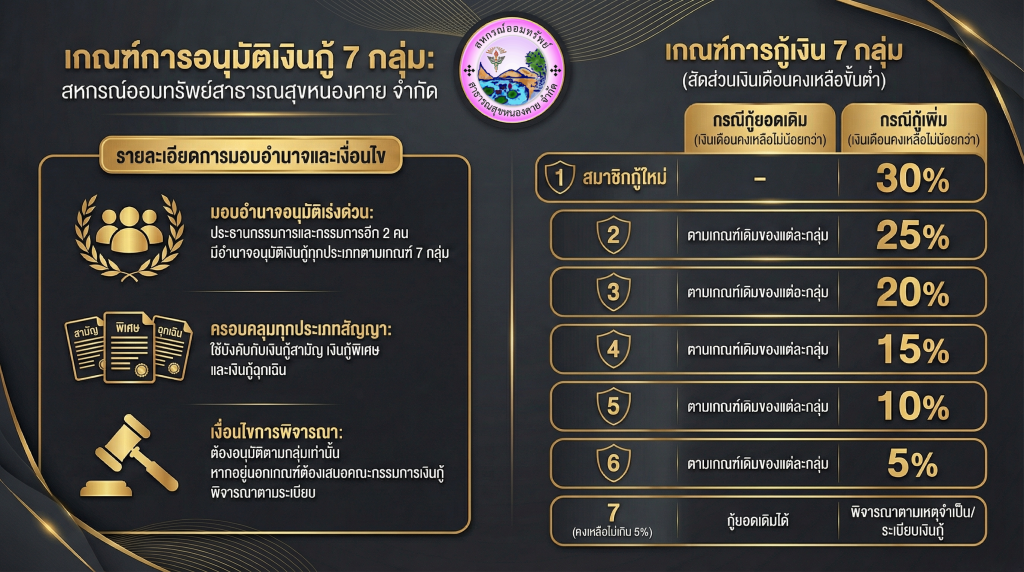 ประกาศ สหกรณ์ออมทรัพย์สาธารณสุขหนองคาย จำกัด ฉบับที่ 2/2569 เรื่อง กำหนดเกณฑ์มอบอำนาจให้ประธานกรรมการและกรรมการอีก 2 คน อนุมัติเงินกู้ทุกสัญญา ทั้งเงินกู้สามัญ เงินกู้พิเศษ และเงินกู้ฉุกเฉิน โดยจัดเป็น 7 กลุ่ม