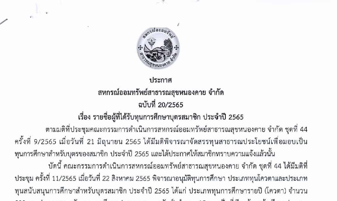 ประกาศ สหกรณ์ออมทรัพย์สาธารณสุขหนองคาย จำกัด ฉบับที่ 20/2565 เรื่อง รายชื่อผู้ที่ได้รับทุนการศึกษาบุตรสมาชิก ประจำปี 2565
