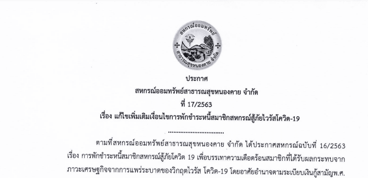 ประกาศ สหกรณ์ออมทรัพย์สาธารณสุขหนองคาย จำกัด ที่ 17/2563 เรื่อง แก้ไขเพิ่มเติมเงื่อนไขการพักชำระหนี้สมาชิกสหกรณ์สู้ภัยไวรัสโควิด-19