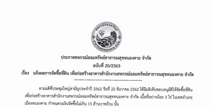 ประกาศสหกรณ์ออมทรัพย์สาธารณสุขหนองคาย จำกัด ฉบับที่ 20/2563 เรื่อง แจ้งผลการจัดซื้อที่ดิน เพื่อก่อสร้างอาคารสำนักงานสหกรณ์ออมทรัพย์สาธารณสุขหนองคาย จำกัด