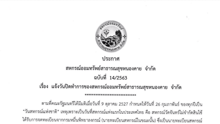ประกาศ สหกรณ์ออมทรัพย์สาธารณสุขหนองคาย จำกัด ฉบับที่ 14/2563 เรื่อง แจ้งวันปิดทำการของสหกรณ์ออมทรัพย์สาธารณสุขหนองคาย จำกัด