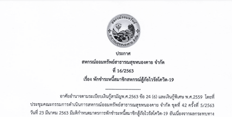 ประกาศ สหกรณ์ออมทรัพย์สาธารณสุขหนองคาย จำกัด ที่ 16/2563 เรื่อง พักชำระหนี้สมาชิกสหกรณ์สู้ภัยไวรัสโควิด-19