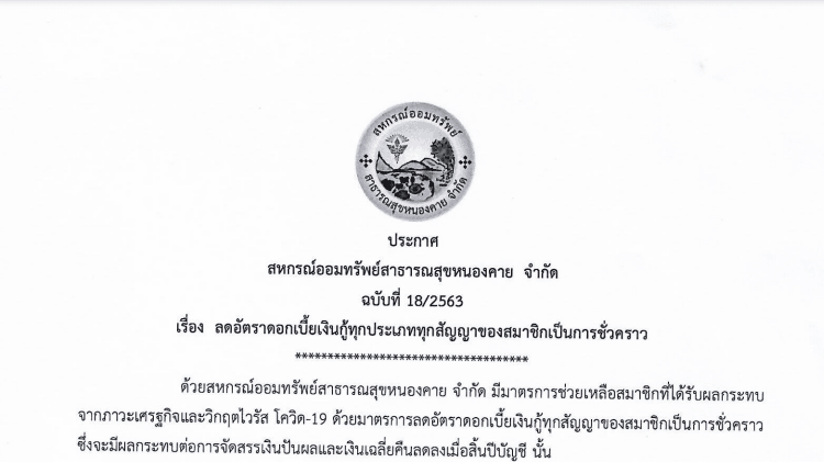ประกาศ สหกรณ์ออมทรัพย์สาธารณสุขหนองคาย จำกัด ฉบับที่ 18/2563 เรื่อง ลดอัตราดอกเบี้ยเงินกู้ทุกประเภททุกสัญญาของสมาชิกเป็นการชั่วคราว
