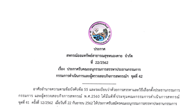 ประกาศ สหกรณ์ออมทรัพย์สาธารณสุขหนองคาย จำกัด ที่ 22/2562 เรื่อง ประกาศรับคณะอนุกรรมการสรรหาประธานกรรมการ กรรมการดำเนินการและผู้ตรวจสอบกิจการสหกรณ์ฯ ขุดที่ 42