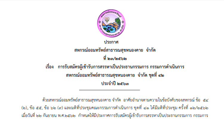 ประกาศ สหกรณ์ออมทรัพย์สาธารณสุขหนองคาย จำกัด ที่ ๒๓/๒๕๖๒ เรื่อง การรับสมัครผู้เข้ารับการสรรหาเป็นประธานกรรมการ กรรมการดำเนินการ สหกรณ์ออมทรัพย์สาธารณสุขหนองคาย จำกัด ชุดที่ ๔๒ ประจำปี ๒๕๖๓