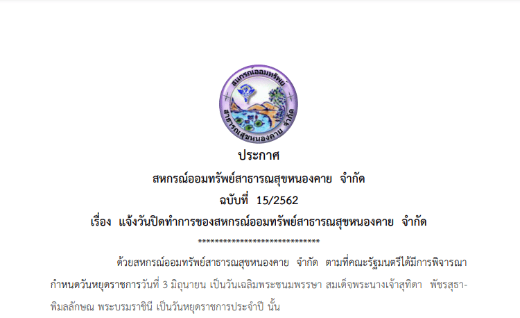 ประกาศ สหกรณ์ออมทรัพย์สาธารณสุขหนองคาย จำกัด ฉบับที่ 15/2562 เรื่อง แจ้งวันปิดทำการของสหกรณ์ออมทรัพย์สาธารณสุขหนองคาย จำกัด