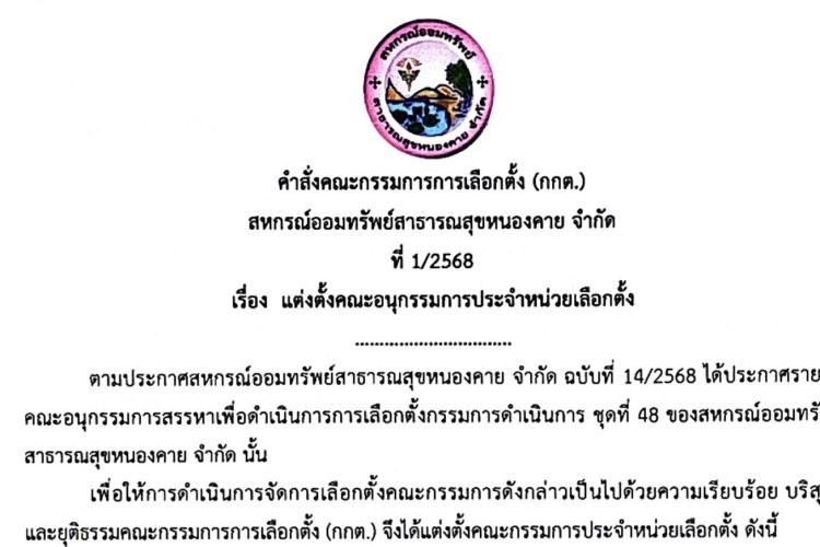 คำสั่งคณะกรรมการการเลือกตั้ง (กกต.) สหกรณ์ออมทรัพย์สาธารณสุขหนองคาย จำกัด ที่ 1/2568 เรื่อง แต่งตั้งคณะอนุกรรมการประจำหน่วยเลือกตั้ง
